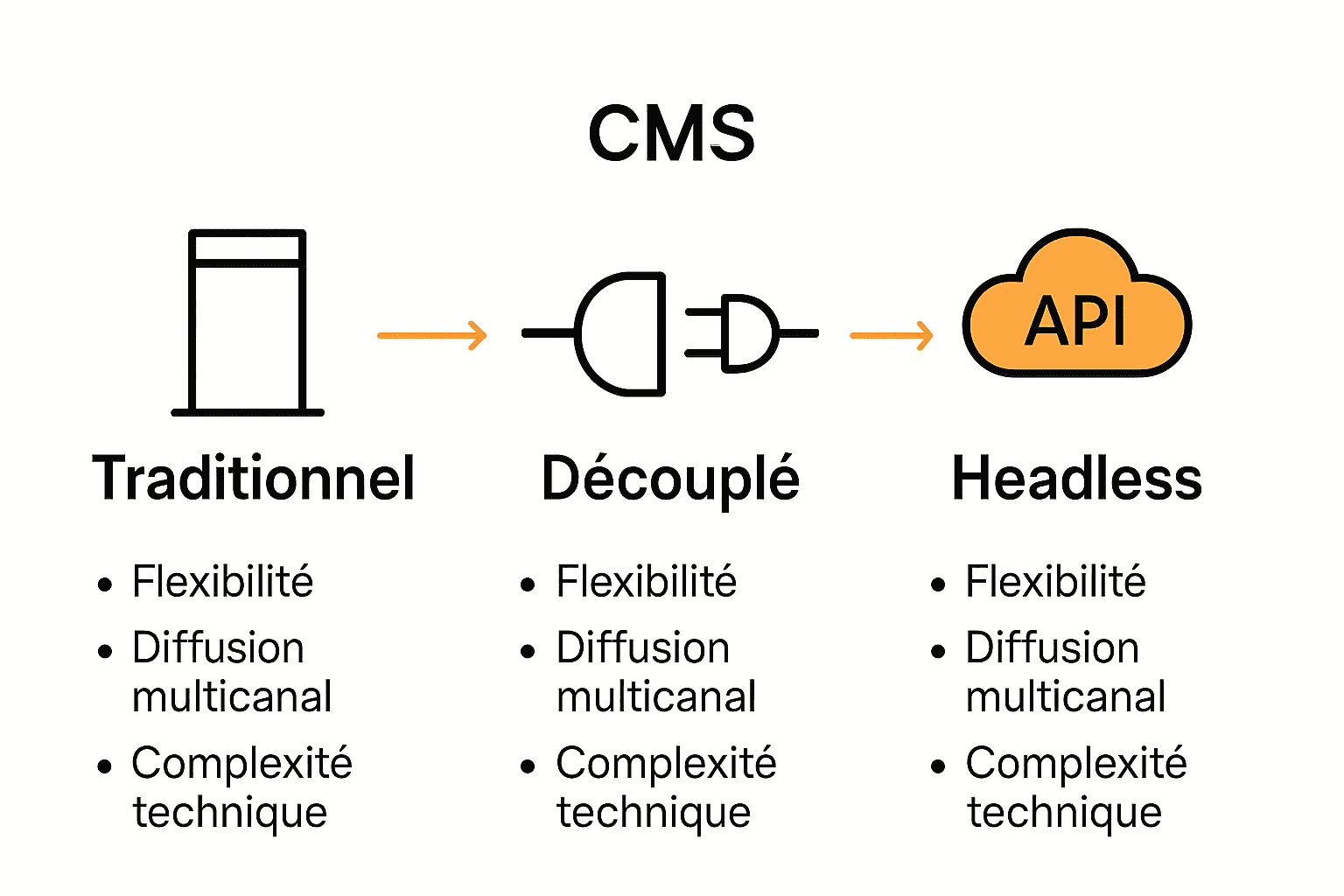 Le CMS traditionnel (monolithique) intègre front-end et back-end dans un même système, tandis que le CMS sans tête sépare ces couches, offrant plus de flexibilité et la possibilité de publier sur plusieurs canaux.